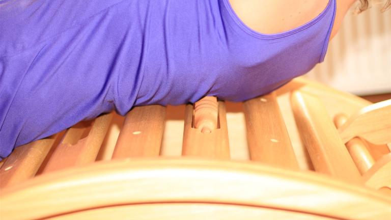 Die Druckmassagewirkung der Rückenmuskulatur erfolgt durch das Ablegen auf dem Riffeldorn. Der Oberkörper wird leicht angehoben, die Position verändert und erneut abgelegt. So kann die Rückenmuskulatur eine Druckmassage erfahren.
